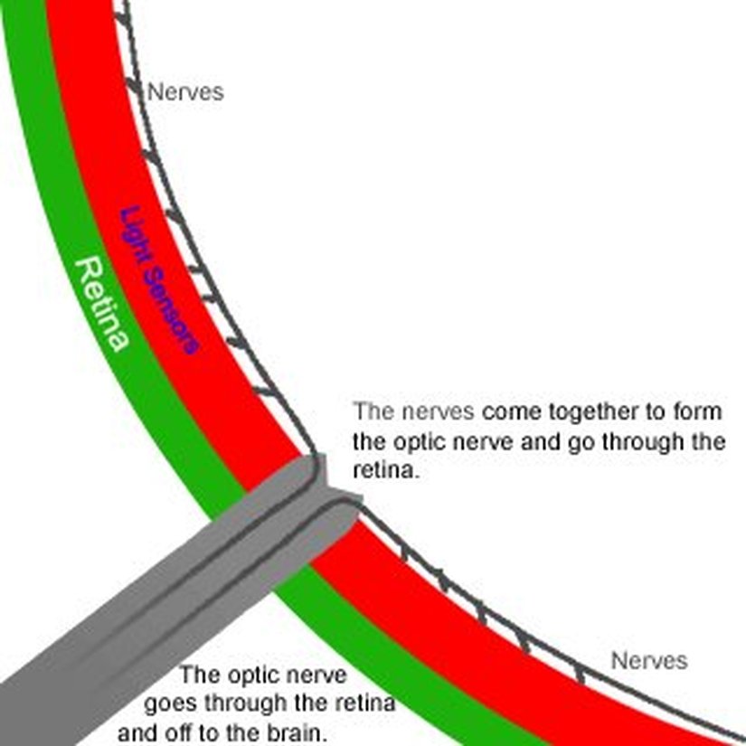 Hata, bununla da sınırlı değildir: bu sinirler gözün en iç kısmında yer aldığı için, bir noktada gözün "içerisinden" geçerek beyne gitmeleri gerekir ve bunun gerçekleştiği bölgede de bir kör nokta bulunmaktadır. Eğer ki gözünüzde yapısal bir sorun olursa -ki Dünya çapında 40 milyon insanın günümüzde mağdur olduğu bir durumdur- ışık bu kör noktaya düşebilir ve burada ışığı algılayan hücreler bulunamadığı için (çünkü oradan damarlar ve sinirler geçmekte ve beyne doğru yol almaktadır- körlük sorunu doğmaktadır.