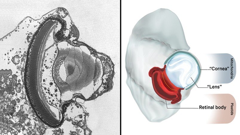 - Warnowiidin gözündeki mitokondriler kornea görevi görürken, plastidlerden oluşan retina ışığı algılar ve bu yapı alglerin genetik materyalini içerir.