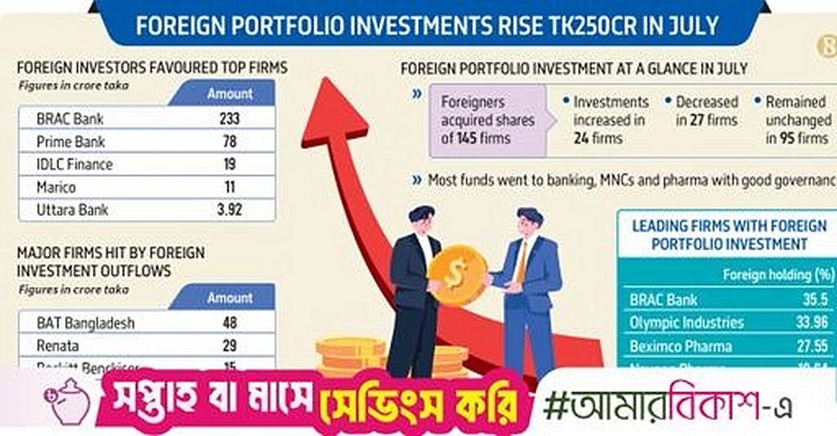 By the end of July, BRAC Bank held 35.5% foreign portfolio investment, with Olympic Industries at 33.96%, Beximco Pharma at 27.55%, Navana Pharma at 19.64%, Renata at 19.43%, and Islami Bank at 17.88%. Analysts told The Business Standard that foreign investors are drawn to firms with strong business potential and robust governance. However, the prevalence of so-called "junk stocks" means that foreign capital tends to concentrate in a select group of companies. Broader economic factors—macroeconomic instability, weak reserves, currency market volatility, and political unrest—also weigh heavily on investor sentiment.