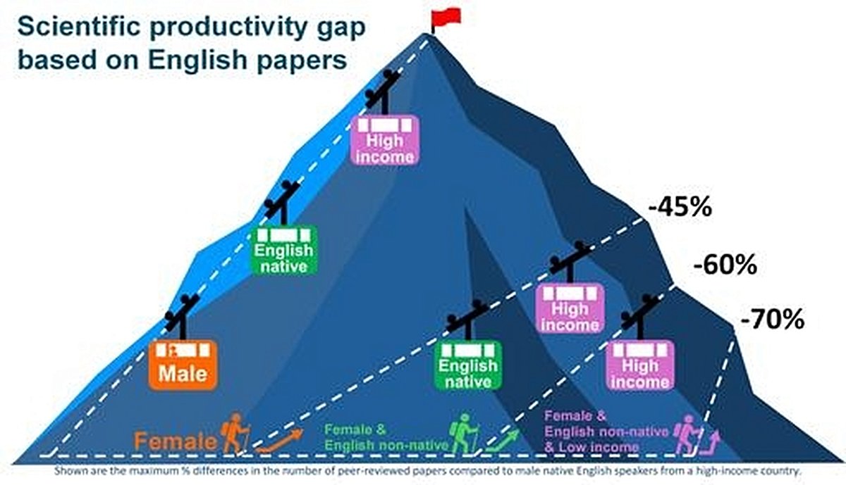 On the same day, PLOS Biology published a study by Tatsuya Amano and colleagues that uncovers a different—but equally consequential—set of biases in the world of science. Their research surveyed 908 environmental scientists from eight countries, including Bangladesh, Bolivia, Britain, Japan, Nepal, Nigeria, Spain, and Ukraine, to examine how gender, language, and income affect scientific productivity as measured by English-language publications. The findings are stark: women, especially early-career women, published 45% fewer English-language papers than men. Women with non-English first languages published 60% fewer, and women from low-income countries with non-English first languages published 70% fewer than men who are native English speakers from high-income countries.