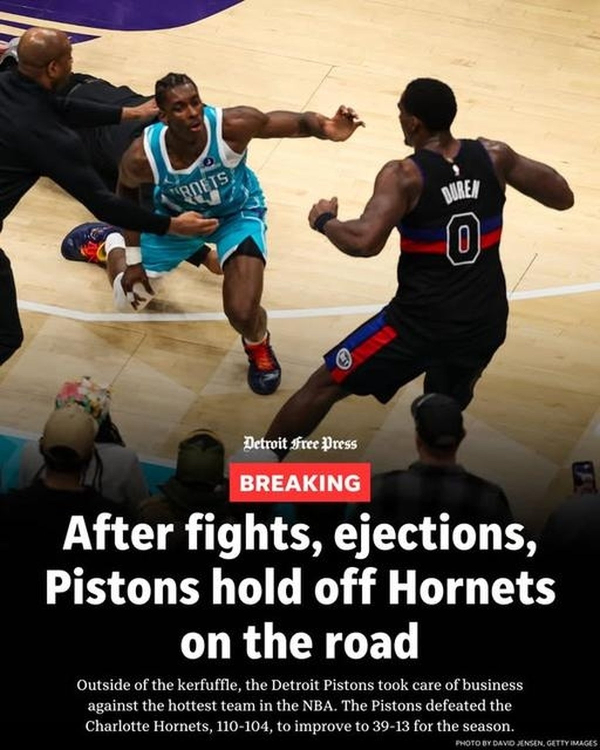 But the postgame conversation was dominated by the brawl and its fallout. Pistons head coach J.B. Bickerstaff was quick to defend his players, shifting blame toward the Hornets. “It was clear, through frustration because of what JD [Jalen Duren] was doing, that they crossed the line,” Bickerstaff told The Athletic’s Hunter Patterson. “I hate that it got as ugly as it got. That’s not something that you ever want to see. But if a guy throws a punch at you, you have a responsibility to protect yourself, and that’s what happened tonight. If you go back and watch the film, they’re the ones that initiated crossing the line, and our guy had to defend himself.”