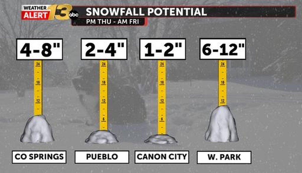 In Colorado Springs and its surrounds, the numbers were even more impressive. Forecasts called for 4 to 10 inches in Colorado Springs proper, 5 to 10 in Monument, 7 to 12 in Manitou Springs and Woodland Park, and 5 to 10 in Palmer Lake. Fort Carson was in the 5 to 10 inch range as well, with places like Rye topping out at 7 to 14 inches. Even outlying areas like Fountain, Cripple Creek, and Falcon were blanketed with several inches.
