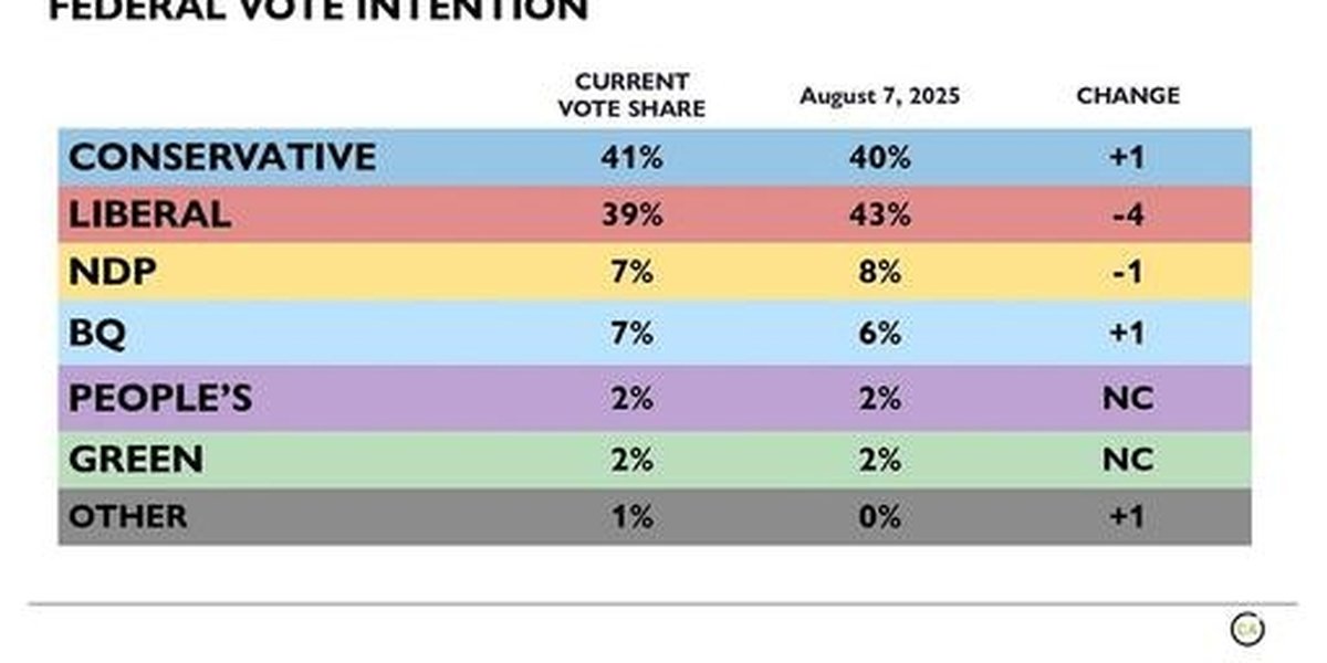 With the dog days of summer winding down, a subtle but meaningful shift is emerging in Canadian federal politics. According to a new Abacus Data poll conducted between August 15 and 19, 2025, the Conservative Party has edged ahead nationally in voter intention for the first time in months. The findings, gathered from 1,915 Canadian adults, come at a moment of heightened anxiety over the rising cost of living and as the political shadow of Donald Trump begins to recede from the Canadian debate. While the survey coincided with Air Canada flight attendants launching strike action and Pierre Poilievre’s byelection win on August 18, most interviews wrapped up before these events could sway public sentiment, meaning the results capture a snapshot of opinion just before the latest tremors hit the political landscape.