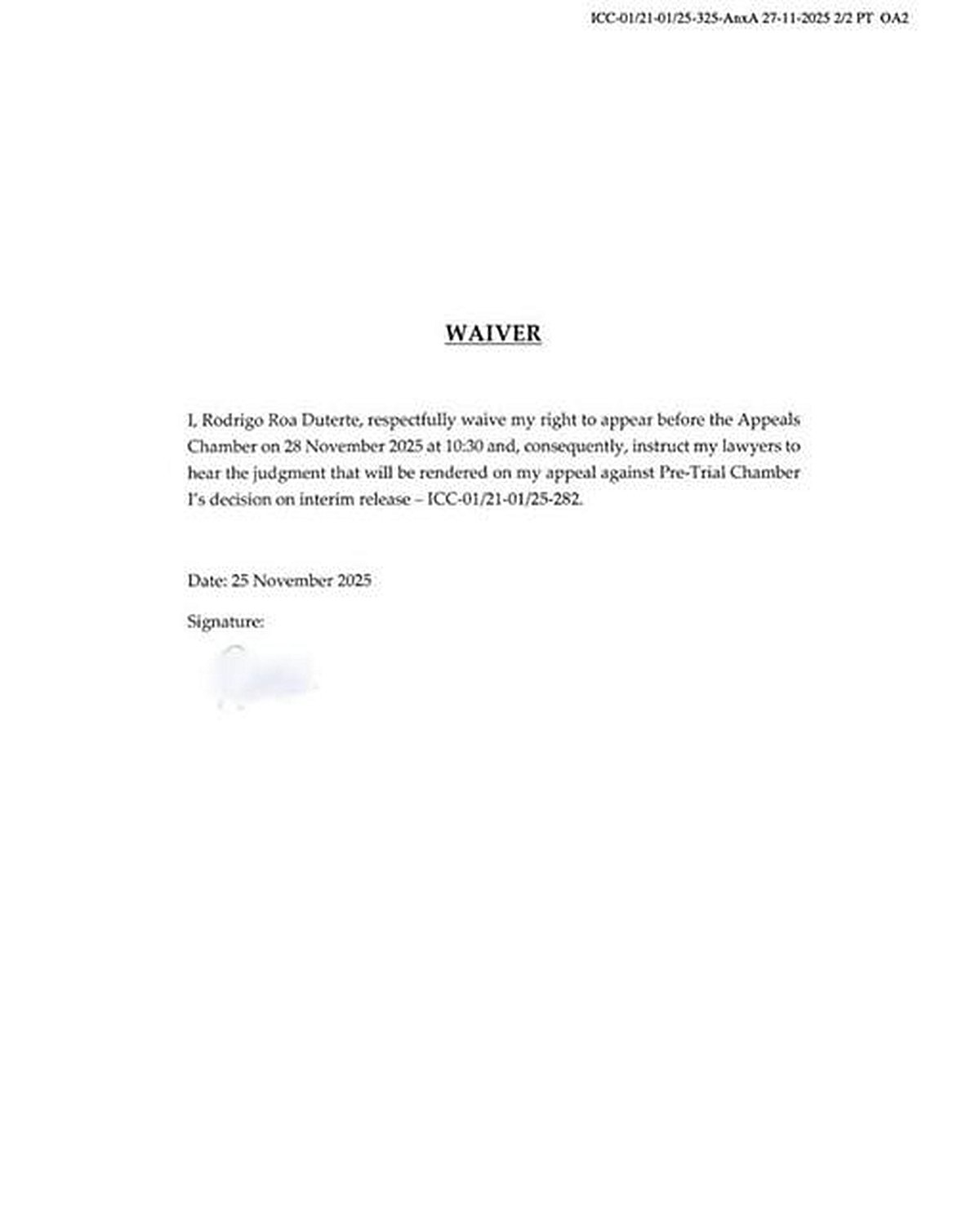 According to Philippine Daily Inquirer and GMA Integrated News, Duterte’s lawyer, Nicholas Kaufman, submitted a signed waiver from the former president, stating: “With the leave of the Appeals Chamber, the Defence hereby places on the record Mr. Duterte’s signed waiver of his right to be present on November 28, 2025, during the reading of the judgment on the Defence appeal against Pre-Trial Chamber I’s decision on interim release.” The document further quoted Duterte himself: “I, Rodrigo Roa Duterte, respectfully waive my right to appear before the Appeals Chamber on 28 November 2025 at 10:30 and, consequently, instruct my lawyers to hear the judgment that will be rendered on my appeal against Pre-Trial Chamber I’s decision on interim release - ICC-01/21-01/25-282.”
