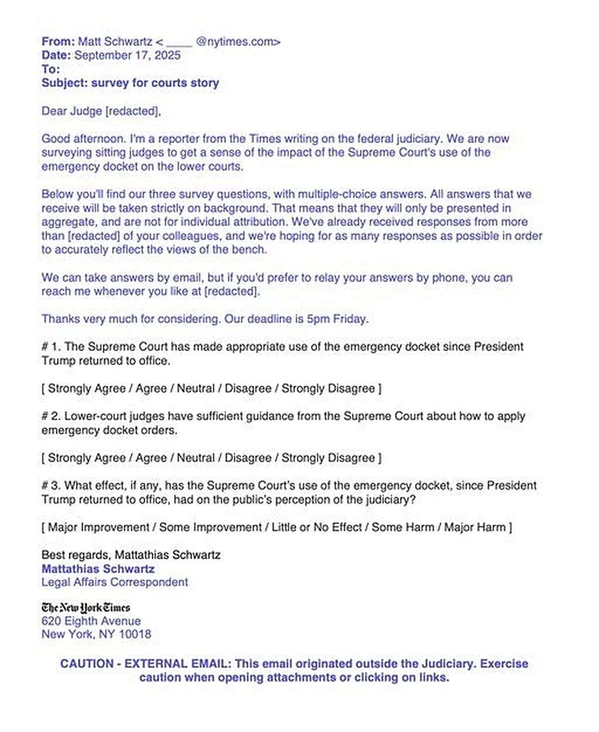 But the survey’s methodology has itself become a point of contention. The Volokh Conspiracy notes that the Times did not seek a random or representative sample of federal judges. Instead, it focused on those in districts most likely to handle challenges to Trump administration policies—a population arguably predisposed to skepticism about the Supreme Court’s interim relief orders. This sampling strategy, critics argue, may have amplified negative sentiments. “Would the Times story hit quite the same way if it had reported ‘Fewer than fifteen percent of surveyed federal judges expressed concern about the Supreme Court’s handling of the shadow docket’?” the blog mused, suggesting that the framing of the results could influence public perception as much as the results themselves.