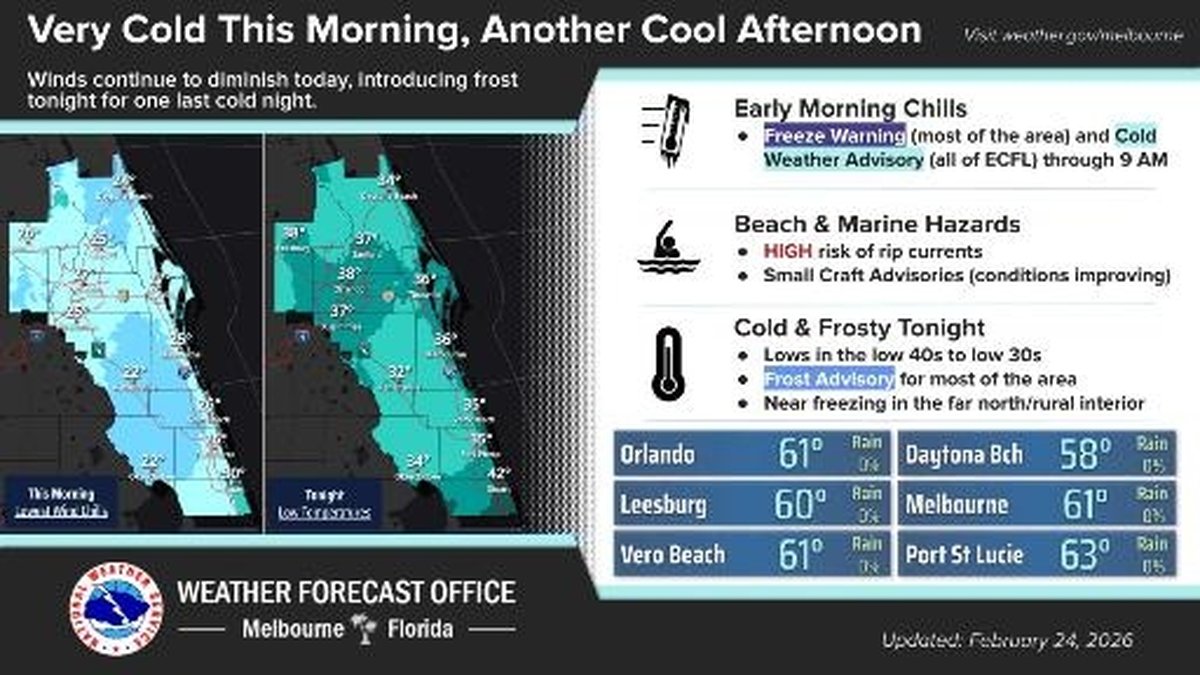 On the morning of February 24, 2026, Central Florida woke up to a rare freeze warning, with temperatures plunging into the 30s and even the upper 20s in some spots. According to FOX 35 Storm Team, wind gusts between 20 and 30 mph made it feel even colder, with wind chills dropping into the mid-30s. The National Weather Service issued a Freeze Warning for nearly all counties in Central Florida—except for coastal Brevard—lasting from 2 a.m. to 9 a.m. Tuesday. Even with the sun shining, highs were forecast to reach only the upper 50s or low 60s, around twenty degrees below normal for this time of year.