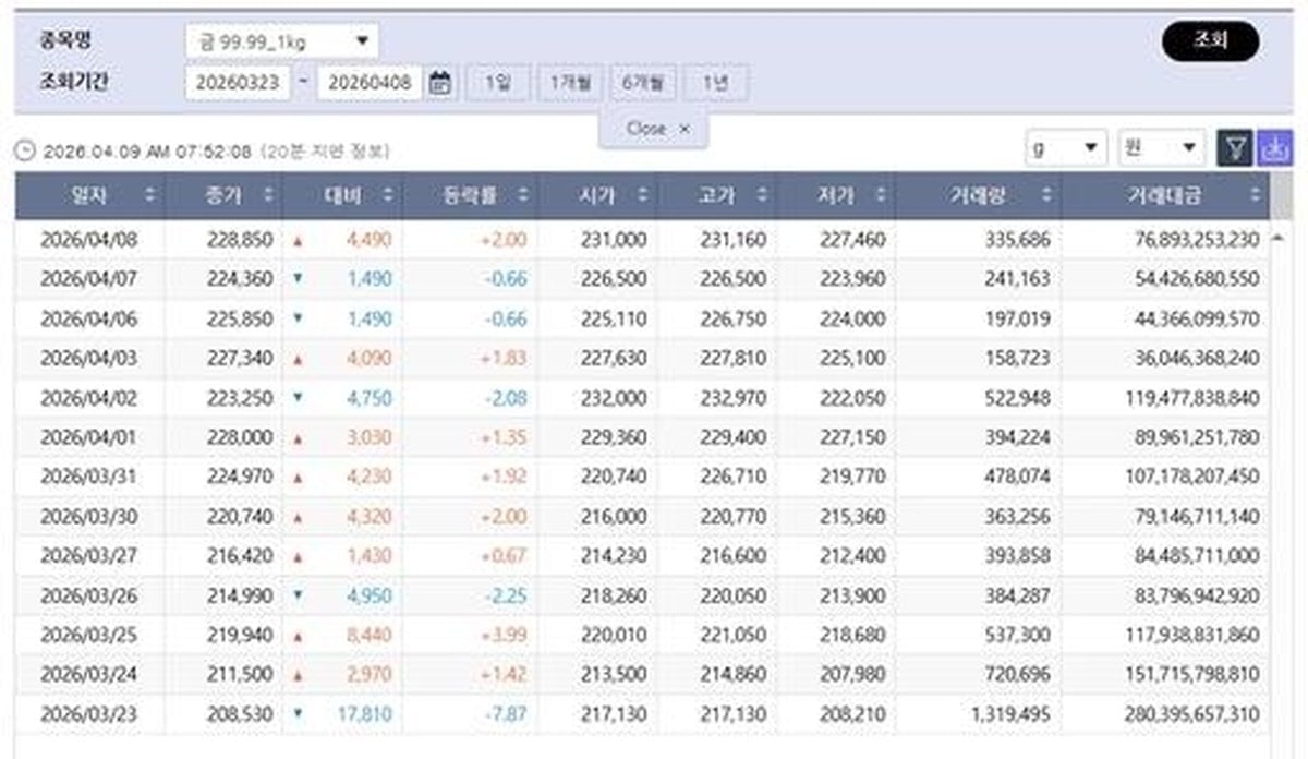 In South Korea, the gold market mirrored global trends. On April 8, 2026, the Korea Exchange (KRX) reported that the domestic price for 99.99% pure gold (1kg) closed at 228,850 KRW per gram, up 4,490 KRW or 2.00% from the previous day. The price for one don (3.75g) gold reached approximately 858,187 KRW. Trading volume for 1kg gold contracts surged to 335,686 units, with a total transaction value of about 76.8 billion KRW, reflecting heightened investor interest.