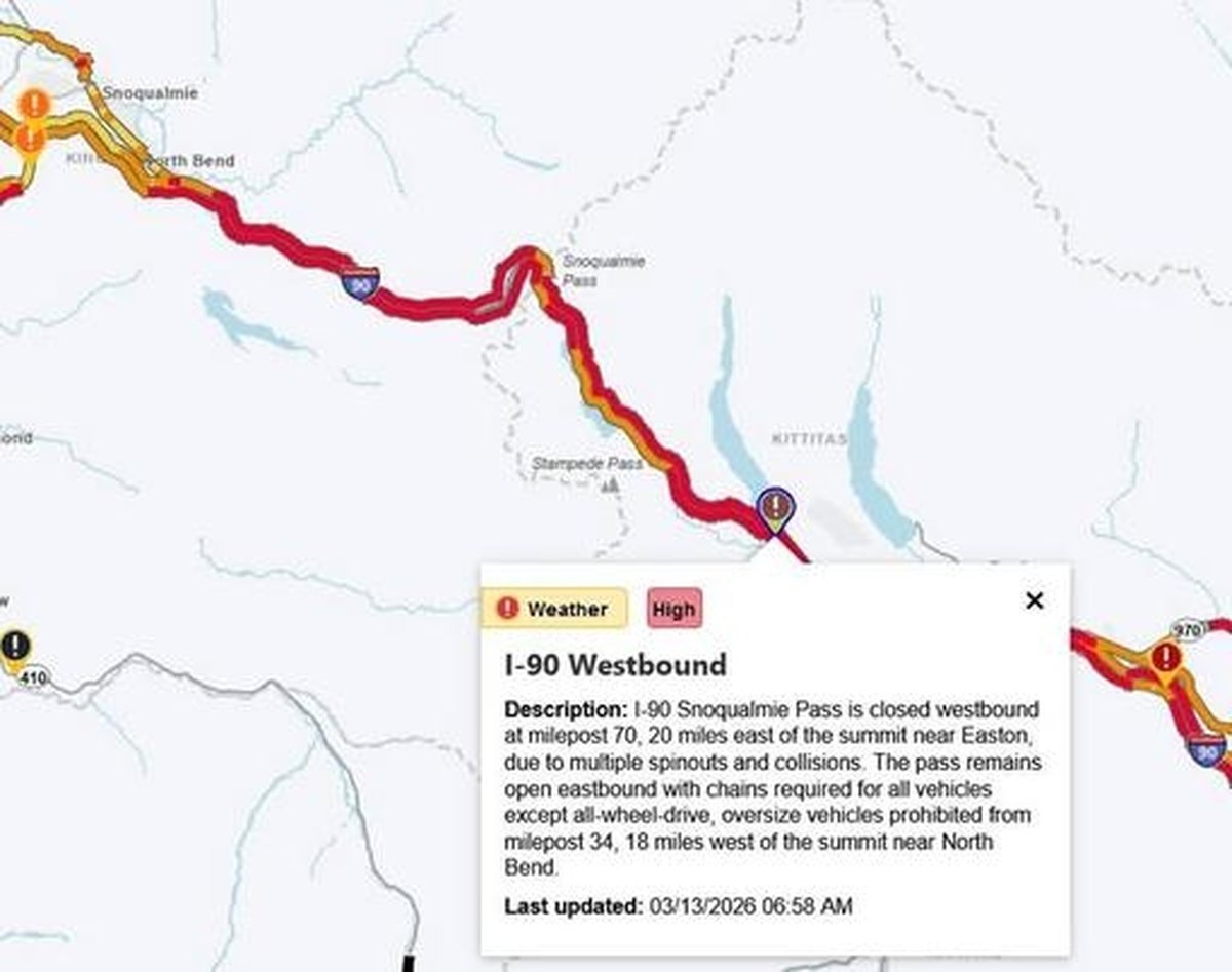But SR 410 was hardly the only trouble spot. The FOX 13 Weather Team issued a Weather Alert Day for Friday morning, citing ongoing snow in the lowlands and mountain passes across western Washington. According to FOX 13, both eastbound and westbound traffic on Interstate 90 (I-90) at Snoqualmie Pass were closed due to heavy snow, collisions, and multiple spinouts. Westbound traffic was first shut down at Easton around 7 a.m., and by 8:15 a.m., eastbound lanes were also closed. "It is currently snowing hard," WSDOT reported, describing road conditions as a treacherous mix of compact snow and ice.