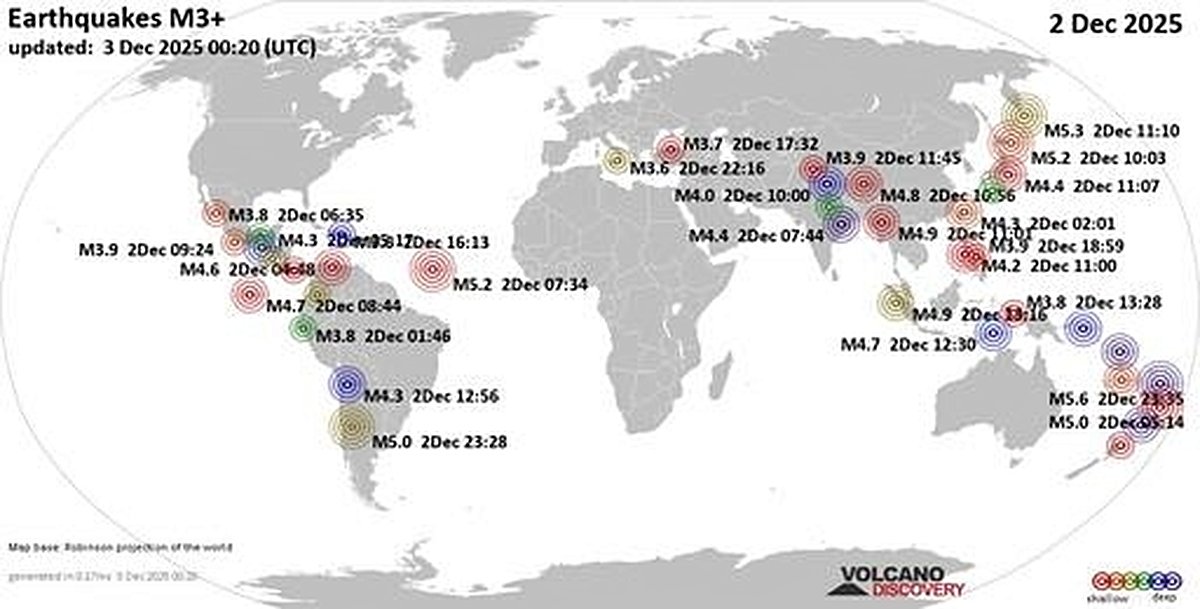 But Japan’s quake was far from an isolated event. According to EarthquakeMonitor’s World Earthquake Report for Tuesday, December 2, 2025, the planet was in the grip of a particularly restless day. In just 24 hours, seismic networks recorded 6 earthquakes of magnitude 5 or higher, 39 quakes of magnitude 4 or above, and a staggering 130 tremors registering 3.0 or more. While the Hokkaido quake drew local attention, it was just one note in a global symphony of tectonic movement.