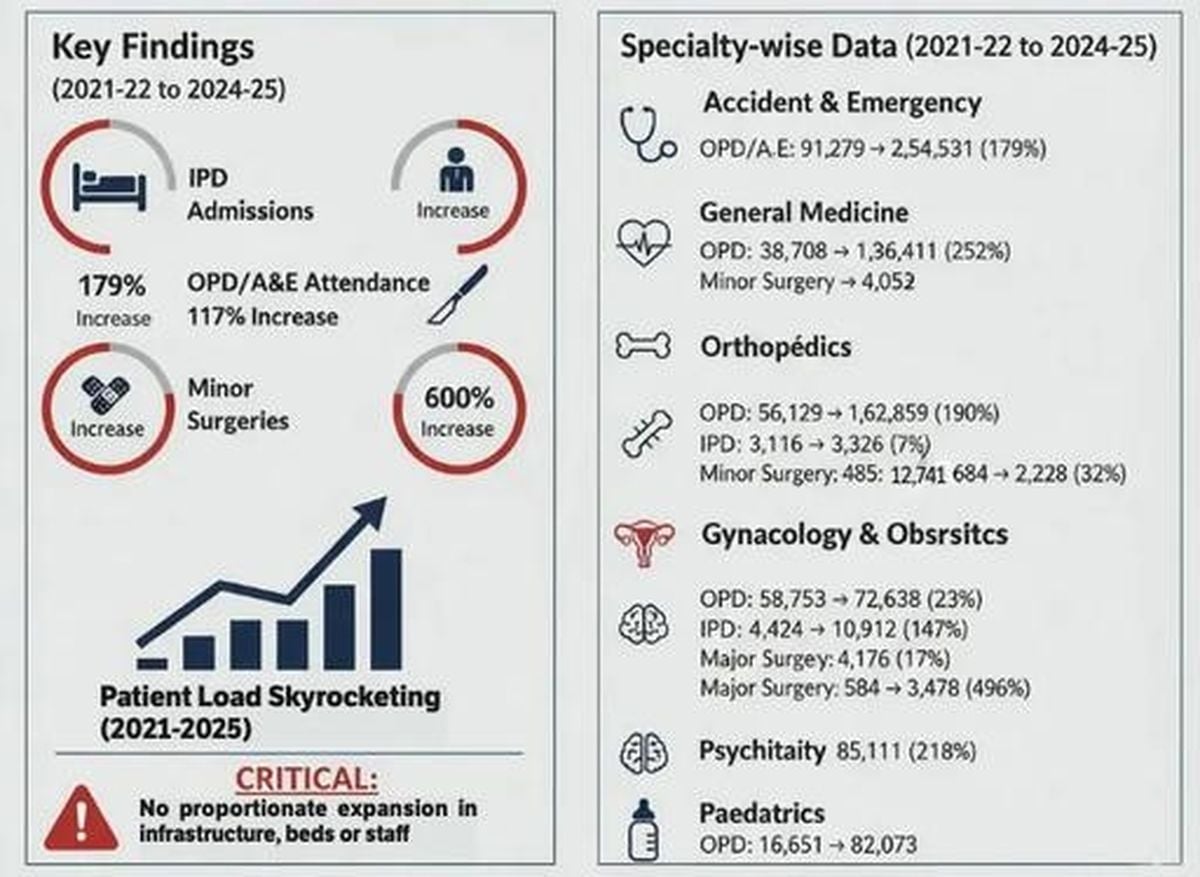 The numbers are staggering. Outpatient and Accident & Emergency (A&E) attendance soared from 91,279 cases in 2021-22 to 254,531 cases in 2024-25, marking a 179% increase in just three years. In the first half of 2025 alone, the A&E department handled 154,115 cases—a relentless influx that, according to the audit, could have catastrophic consequences if not addressed. The report explicitly warns that, "the disproportionate growth of service must have been responded to by strengthening of infrastructure, bed strength and manpower availability, which has not happened."