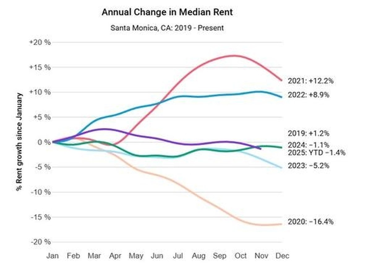 Across the country in Santa Monica, the housing market’s story in 2025 was one of cooling after a period of intense heat. Rents fell 1.2 percent in November alone, capping a year-over-year decline of 0.1 percent, as reported by Apartment List’s December 2025 report. The median rent for a one-bedroom apartment stood at $2,316, while two-bedrooms averaged $2,776. The citywide apartment vacancy rate reached 5.2 percent, up 0.7 percentage points from the previous year, reflecting a broader national slowdown in the rental market. Indeed, November marked the slowest rental month in the country, with nationwide rents now 5.2 percent below their 2022 peak.