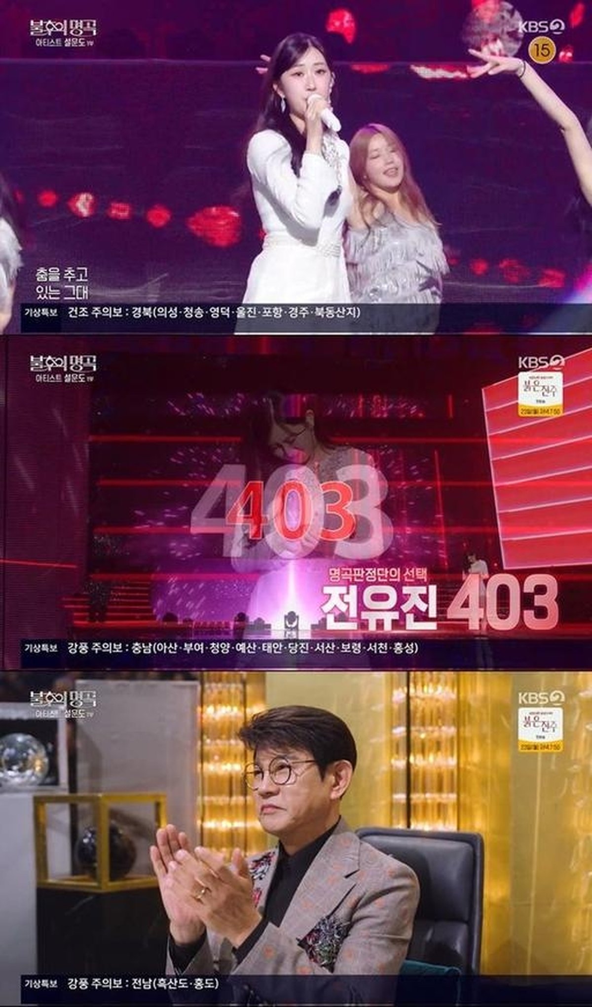 One of the night’s standout performances came from Jeon Yu-jin, who took to the stage third and tackled Seol Woon-do’s classic “Lady of Samba” (“쌈바의 여인”). With her robust vocals and fiery stage presence, Jeon commanded the audience’s attention from the first note. As reported by Celuv Media, Seol Woon-do himself was effusive in his praise, declaring, “You should be nervous. That was a truly happy stage.” The compliment, coming from the original artist, carried extra weight. Jeon’s efforts were rewarded with 403 votes, earning her a victory over Cheon Rok-dam and further cementing her reputation as a rising star in the genre.
