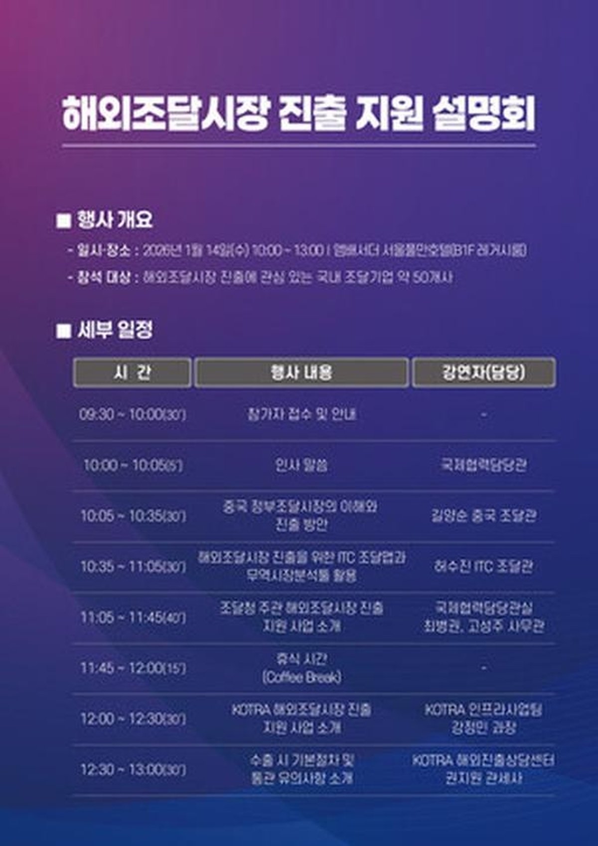 Against this backdrop of currency pressures and policy recalibration, South Korea is also doubling down on efforts to expand its export channels, particularly for small and medium-sized enterprises (SMEs). On January 14, 2026, the Public Procurement Service (PPS) hosted an “Overseas Public Procurement Market Entry Support Briefing” at the Ambassador Seoul Pullman Hotel, inviting approximately 60 procurement companies to encourage bids with foreign governments and international organizations.