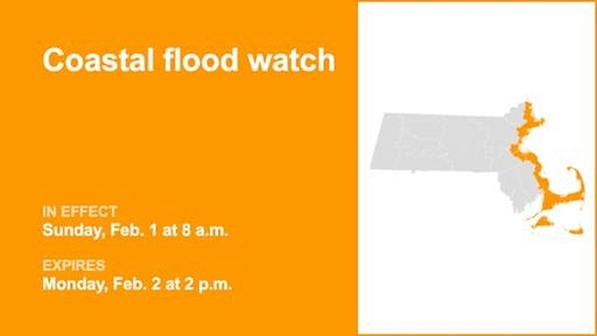“Moderate coastal flooding is possible around high tide. Water could be as deep as 1 to 2 feet,” the NWS stated in a Coastal Flood Watch issued for Sunday morning through Monday afternoon. The affected counties include Essex, Suffolk, Norfolk, Plymouth, Barnstable, Dukes, and Nantucket. The advisory warns that “debris may wash onto coastal roads from large breaking waves. Significant beach and dune erosion is likely, especially in those areas that have been made more vulnerable from recent storms.”