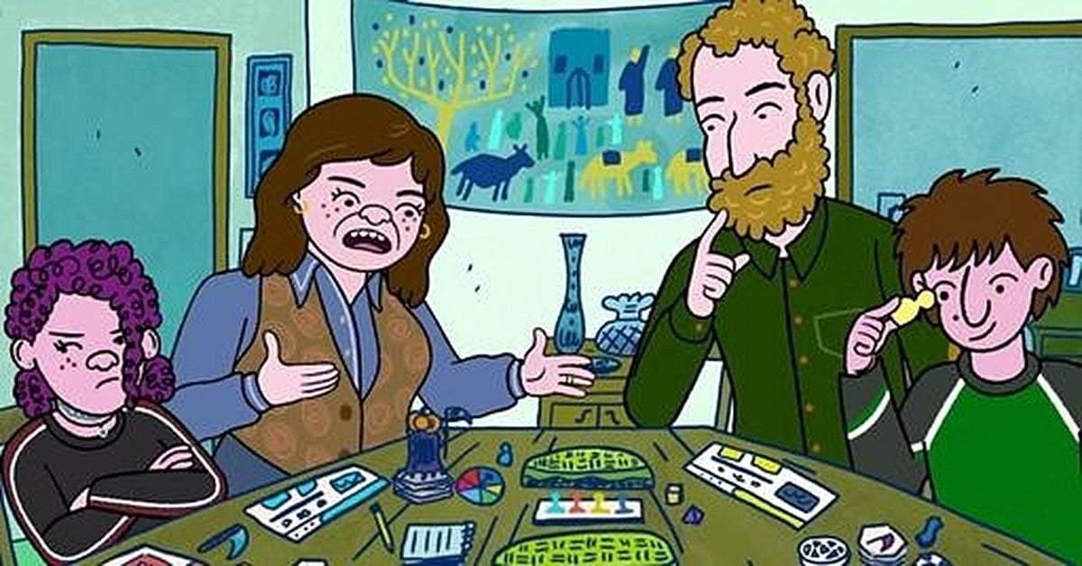 The show’s grounded animation style is punctuated by surreal flourishes—a cutthroat corporate striver works at a Chuck E. Cheese competitor called BJ Bananafingers, and an abandoned classroom is overtaken by wolves—reminding viewers that while the Schwoopers’ world is recognizably real, it’s also filtered through the heightened lens of animation. The medium enables voice actors to portray their characters from childhood through old age, further blurring the lines between past and present.