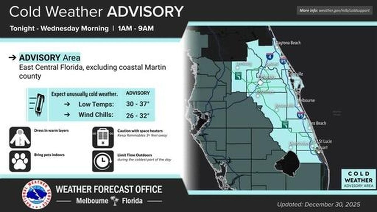 According to the National Weather Service Melbourne FL, the cold front moved southward through the region, bringing with it a blast of arctic air. Wind chill values were forecasted to plummet into the mid-20s to mid-30s overnight, with actual morning lows expected to range from 28 to 40 degrees Fahrenheit across much of Central Florida. The Service issued a Cold Weather Advisory for nearly all of the Orlando area, sparing only coastal Martin County, and a Freeze Watch for Lake and inland Volusia counties from late Tuesday into Wednesday morning. As the Orlando Sentinel reported, "Wind chills this cold could be hazardous for those without access to adequate warmth, clothing, or shelter." In response, many cold-weather shelters opened their doors to support at-risk individuals.