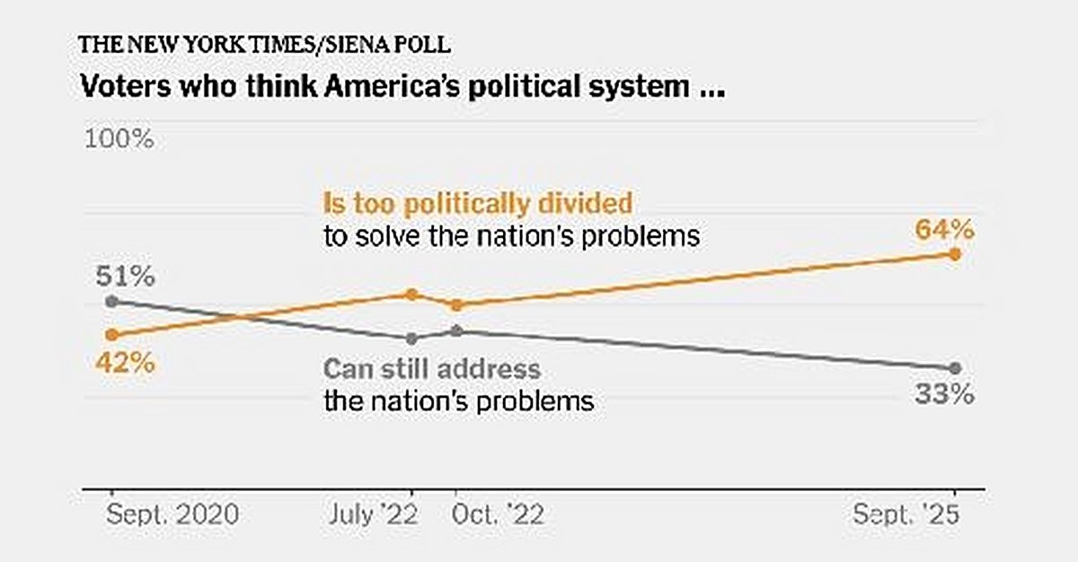 Americans’ faith in the country’s ability to overcome political divisions has reached a new low, according to a flurry of recent polls and interviews that paint a sobering picture of the national mood in the fall of 2025. The latest survey, released October 2 by The New York Times and Siena University, found that just 33 percent of registered voters believe the United States can still solve its political problems—a dramatic drop from the 51 percent who felt that way in September 2020, even as the nation was mired in the COVID-19 pandemic.