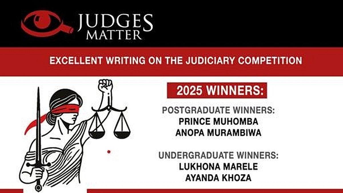 According to Judges Matter, the competition, launched in 2021, aims to foster critical thinking and engagement with pressing issues facing South Africa’s judiciary. This year’s winners—Prince Muhomba and Anopa Murambiwa in the postgraduate category, and Lukhona Marele and Ayanda Khoza among undergraduates—offered nuanced analyses of the threats to and opportunities for judicial independence.