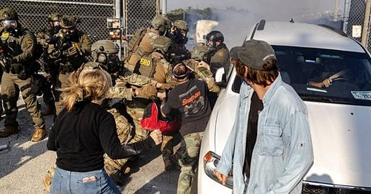 That morning, federal agents in riot gear fired pepper balls and tear gas from the rooftop and ground level, dispersing the crowd and taking at least three protesters into custody. Later in the afternoon, as reported by The Guardian, additional arrests were made, including a female protester who was swarmed by masked agents in front of the media. Some demonstrators were seen slashing the tires of a minivan entering the facility, and ICE described the protesters as “rioters” who assaulted law enforcement, blocked entrances, and trespassed on private property.