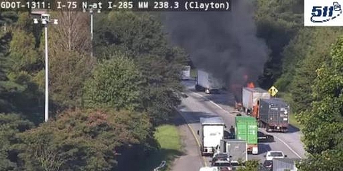 At 9:15 a.m., a multi-vehicle crash involving a truck fire erupted on the I-75 Northbound exit ramp to I-285 West (Exit 238) in Clayton County, not far from the Atlanta airport. Traffic cameras captured thick plumes of smoke billowing skyward as firefighters and emergency crews raced to the scene. All lanes on the ramp were quickly closed as responders worked to extinguish the flames and clear the tangled wreckage.
