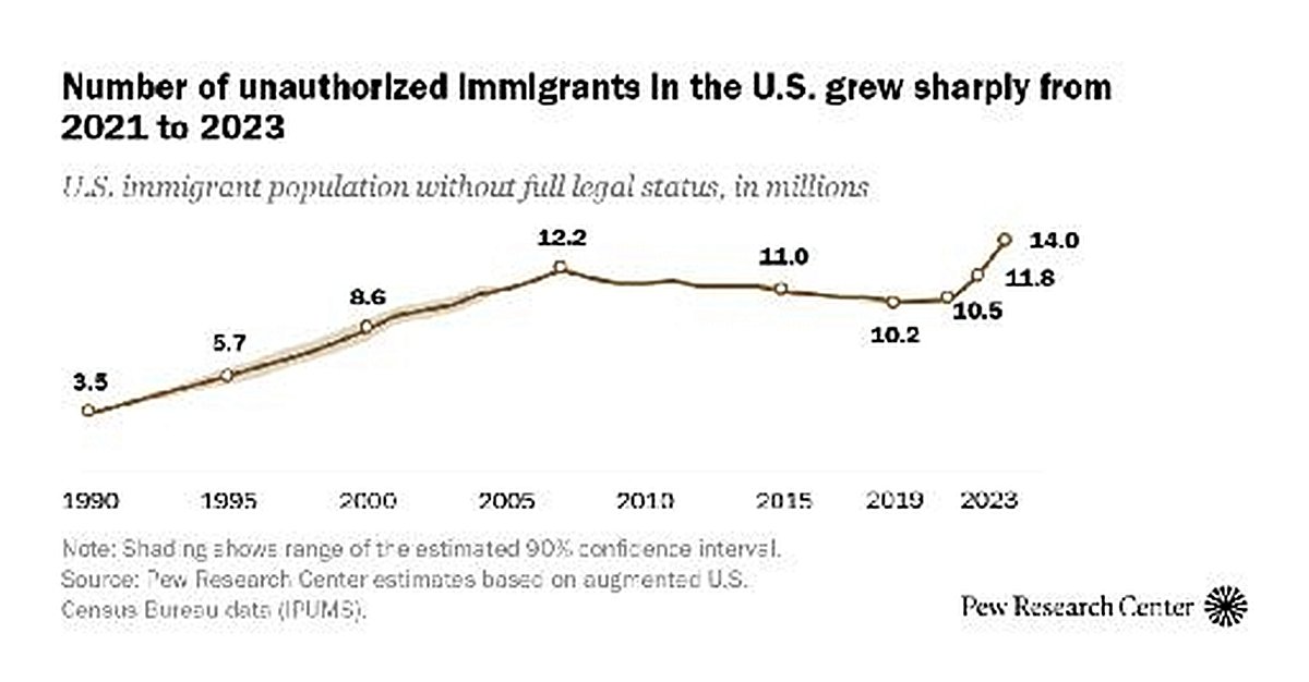 This new era comes on the heels of a historic surge. Between 2020 and 2025, more than 11 million immigrants arrived in the U.S., including over 3 million in 2023 alone—the largest annual total ever recorded, according to Pew’s analysis of government data. The unauthorized immigrant population, those living in the country without full legal status, reached a record high of 14 million in 2023 after two consecutive years of sharp growth. That group accounted for 27% of all U.S. immigrants and 4.1% of the total U.S. population.