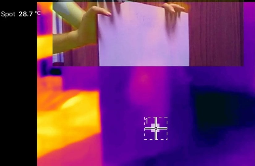 Eğer kızılötesi ışınları gerçekten yansıtan bir yüzeyin neye benzeyeceğini merak ediyorsanız, uzay battaniyesi olarak da bilinen ve acil durum teknisyenlerinin hastalar üzerine örttüğü battaniyelere bakabiliriz. Benzer şekilde, bir nesne üzerinde suyun var olup olmadığı da kızılötesi yansıtıcılığını etkilemektedir. Aşağıda hem üzerine su dökülmüş bir tişörtü hem de sağ tarafta uzay battaniyelerinde de kullanılan mylar malzemesinden üretilen bir parçayı görebilirsiniz: