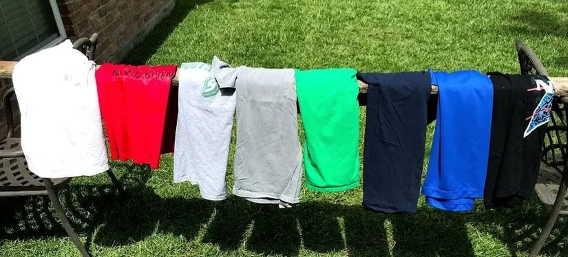 Rhett AllainEğer bu giysilere kızılötesi kamerayla bakacak olursanız, aşağıdaki gibi görürdünüz. Elbette kızılötesi gerçekte böyle gözükmez. Kızılötesi kameralar, kızılötesi ışınları gözle görünür dalgaboylarındaki renklerle (mor, kırmızı, sarı, vs.) eşleyerek renklendirirler. Ama o renkler arasındaki farklar, kızılötesi radyasyon frekanslarındaki farklarla birebir örtüşür ve bu sayede bize bilgi verir. Bunu yaptığımızda, ortaya böyle bir görüntü çıkar: