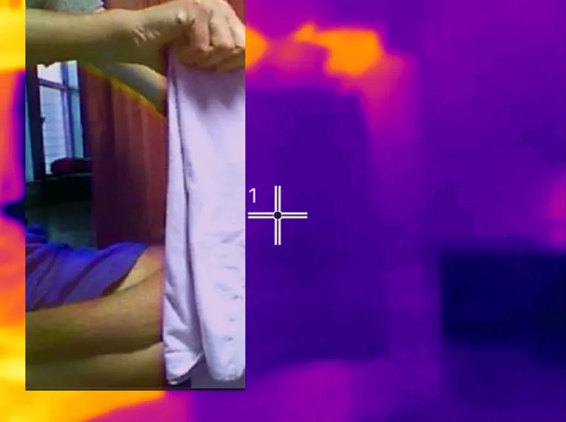 Bunu yapmak için, ikinci bir test yapabiliriz. Farklı tişörtlerin kızılötesi ışınları yansıtma miktarını ölçmek için, sıcak olan ama çok sıcak olmayan bir ütü kullanabiliriz. Ütü, bizim kızılötesi kaynağımız olarak davranacaktır. Bunu, kameranın görüş alanının dışına koyarak, kameranın görüş alanındaki nesnelere kızılötesi ışınlar gönderebiliriz. Böylece kızılötesi ışınları nasıl yansıttıklarını görebiliriz.