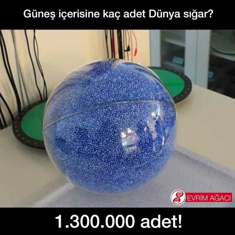 - Güneş'in içine Dünya yaklaşık 1,3 milyon kez sığabilir ancak kürelerin paketlenme yoğunluğu en fazla %74 olduğu için gerçek sayı yaklaşık 962.000 Dünya'dır.