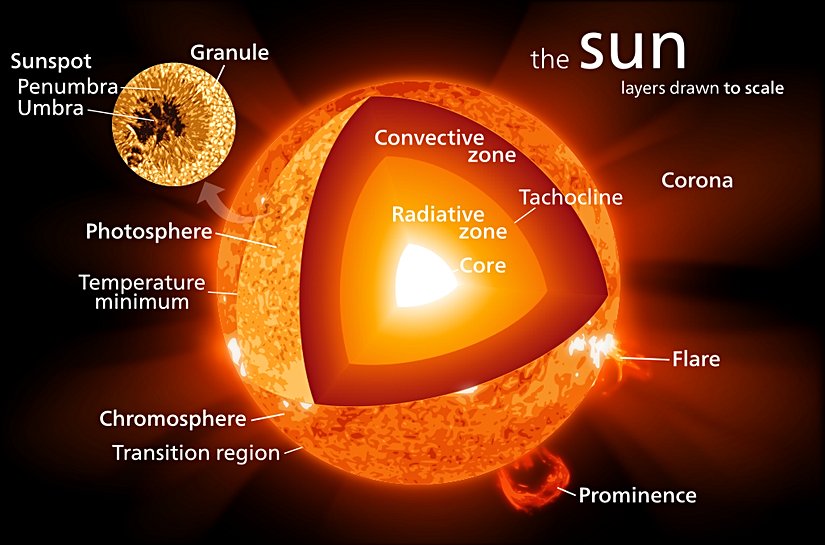 Güneş’in çapı Dünya’nınkinin 109 katı ve kütlesi de 330.000 katıdır. Güneş Sistemi’ndeki toplam kütlenin %99,8’ini barındıran Güneş, ana olarak hidrojen (%72) ve helyumdan (%26) oluşmaktadır. Kalan kütleyi ise daha ağır elementler meydana getirir. Güneş’teki her 1 milyon hidrojen atomuna karşılık 98.000 helyum, 850 oksijen, 360 karbon, 120 neon, 110 azot, 40 magnezyum, 35 demir ve de 35 silikon atomu bulunur. (Hidrojenin toplam kütlede sadece %72 olmasının nedeni, bir hidrojen atomunun kütlesinin diğerlerine göre çok küçük olmasıdır). Güneş resimlerinde gördüğünüz benek benzeri lekeler aslında yüzeydeki soğuk bölgelerdir. Tabi “geri kalan bölgelere göre soğuk” demek istiyoruz. Bu lekelerin sıcaklığı 2700–4200 C arasında değişmektedir.