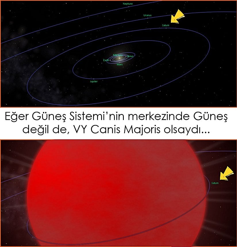 Eğer sistemimizin merkezinde Güneş yerine Canis Majoris bulunsaydı, çapı neredeyse Satürn'e kadar ulaşırdı! Zira bu dev kırmızı hiperdevin yarıçapı, Güneş'imizinkinin ortalama 1420 katına eşittir!