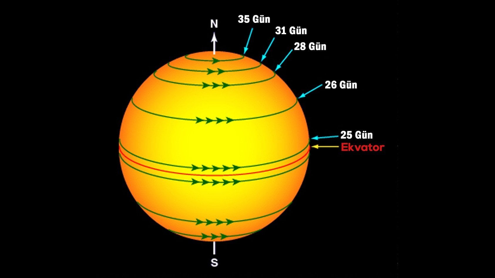 - Güneş, kendi ekseni etrafında yaklaşık 27 Dünya gününde dönerken, farklı katmanları farklı hızlarda hareket eder; ekvator 25 günde, kutuplar ise 35 günde döner.