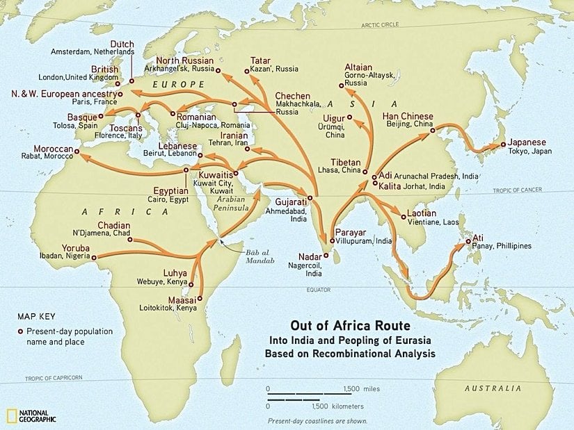 Bazı atalarımız gibi biz insanlar da Afrika'da evrimleştikten sonra diğer kıtalara yayılmış bir türüz. Ancak bunu yaparken oldukça ilginç bir rota izledik: Neredeyse hep deniz kenarlarını takip ettik; hatta o sayede Japonya ve Filipinler gibi adalara ulaştık; hatta Bering Boğazı üzerinden Amerika kıtasına geçebildik.