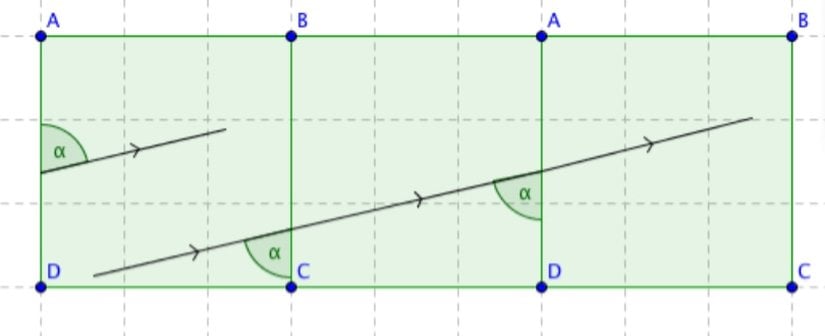 Topumuz bir periyoda girene kadar (ilk karedeki yörüngeye geri döndüğümüzde) bir sonraki duvara çarptığında da aynısını yapalım. Bu bize düz bir çizgi verecektir ve jeodezi kavramına yakınlaştıracaktır. Topu bu karenin kenarlarına tekrar tekrar yansıttığımızda topun yörüngesini yakalamak için sadece dört kare gerektiğini görürüz. Yani bir noktadan sonra üretilen tüm kopyalar bu dört kareden oluşan kopyayla aynı olacaktır.