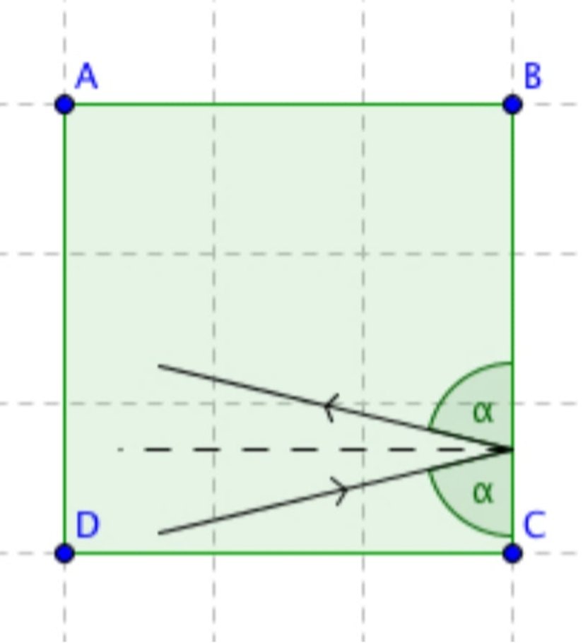 En basit şekle sahip olan bir masayla, kareyle başlayalım. Karenin köşelerini A, B, C ve D olarak adlandıralım. Şimdi topun CD kenarına yakın bir yerden, yörüngesinin çarptığı kenarla α\alpha açısı yapacak şekilde atıldığını varsayalım.
