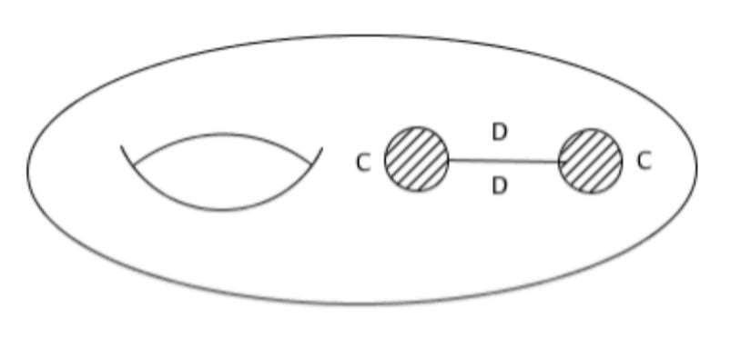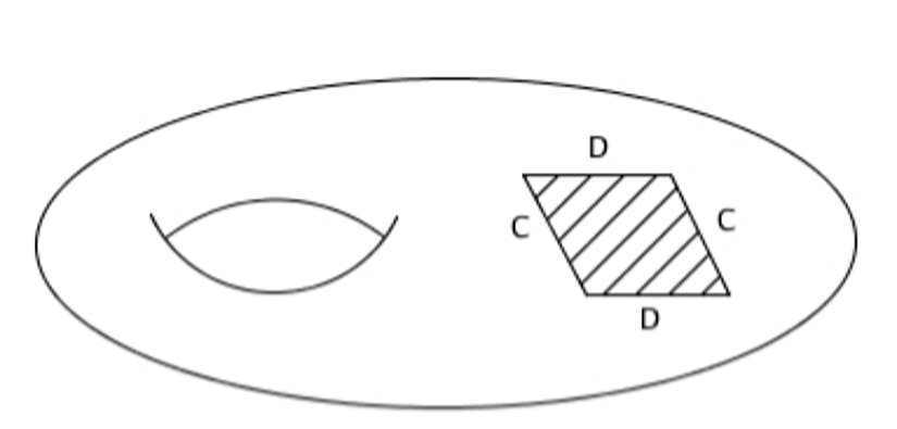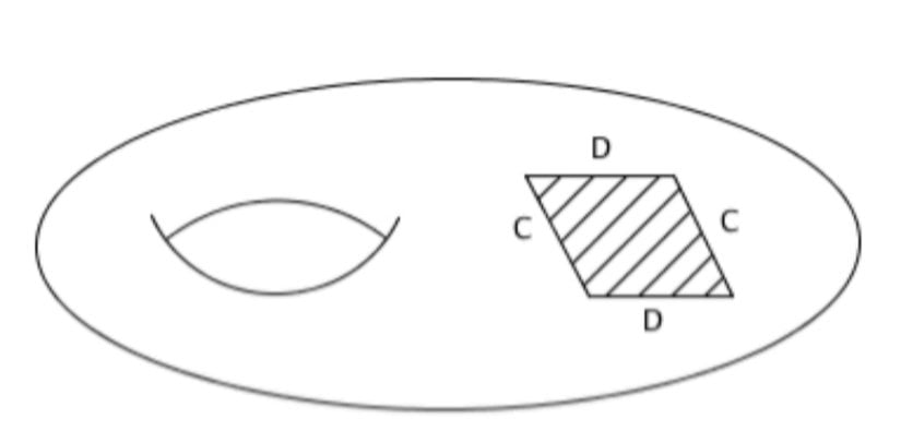 Şimdi eşkenar dörtgen şeklindeki deliğin karşılıklı D kenarlarını yapıştırırsak bu, sınırları C kenarına denk gelen iki yeni boşluk oluşturur.