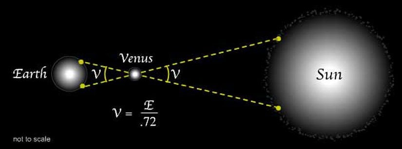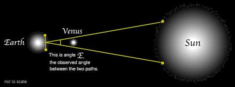 Gözlemden ΔθΔθ'ı çıkardığımızda Dünya ile Venüs arasındaki mesafe şu formül ile bulunur:
