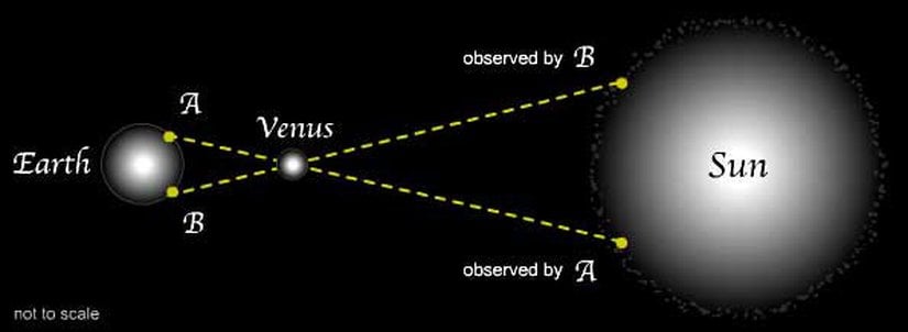 Bu metot Venüs'ün Güneş önünden geçerken Dünya'nın farklı yerlerinden aynı anda gözlemlenmesine dayanıyor. Şekilde görüldüğü gibi kuzeyden ve güneyden aynı olayı gözlemleyen iki gözlemci, Venüs'ü farklı açılardan görecek ve bu nedenle Venüs'ün güneş üzerinden geçtiği süreyi ve Güneş üzerinde kat ettiği yolu farklı ölçeceklerdir.