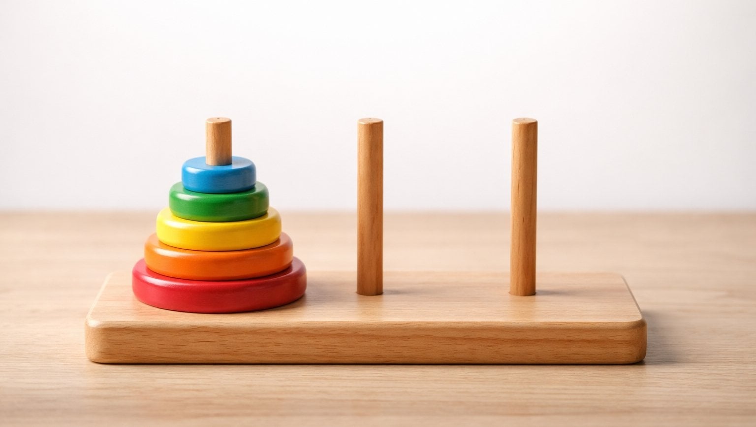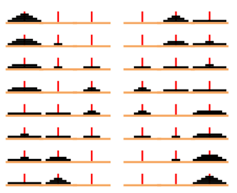 Orta kısım boş olduğuna göre üçüncü disk buraya gelir. En sağdaki küçük disk sola geçer, ortanca ortaya gelir ve küçük tekrar ortaya gelir. Böylelikle üç disk problemi çözülmüş olur. Üç disk problemini çözdük ve üç disk de ortada. Böylelikle dördüncü ve en büyük olanı sağa koyabiliriz. İşte tam bu sebepten ilk hamleyi ortaya yaptık.