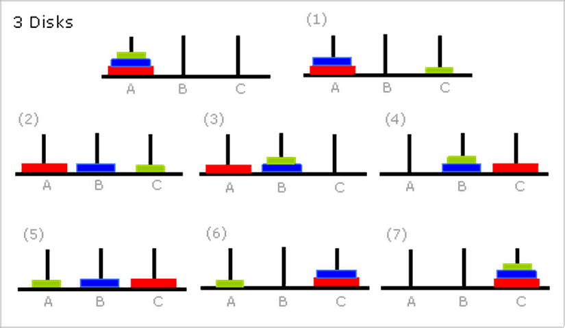 Aynı mantığı üç disk için düşünelim. Üç diski sağ tarafa taşımak istiyoruz. Öyleyse iki diski ortada toplamalıyız ki fazladan olan en büyük disk sağ tarafa gelebilsin. İki diski ortada toplayabilmek içinse bir üstteki adımın geçerli olduğunu göreceksiniz. Küçük olanı en sağa almalıyız ki ikinci disk ortaya gelebilsin. Bu yüzden, üç diskli problemde, ilk hamle en sağa koymaktır.