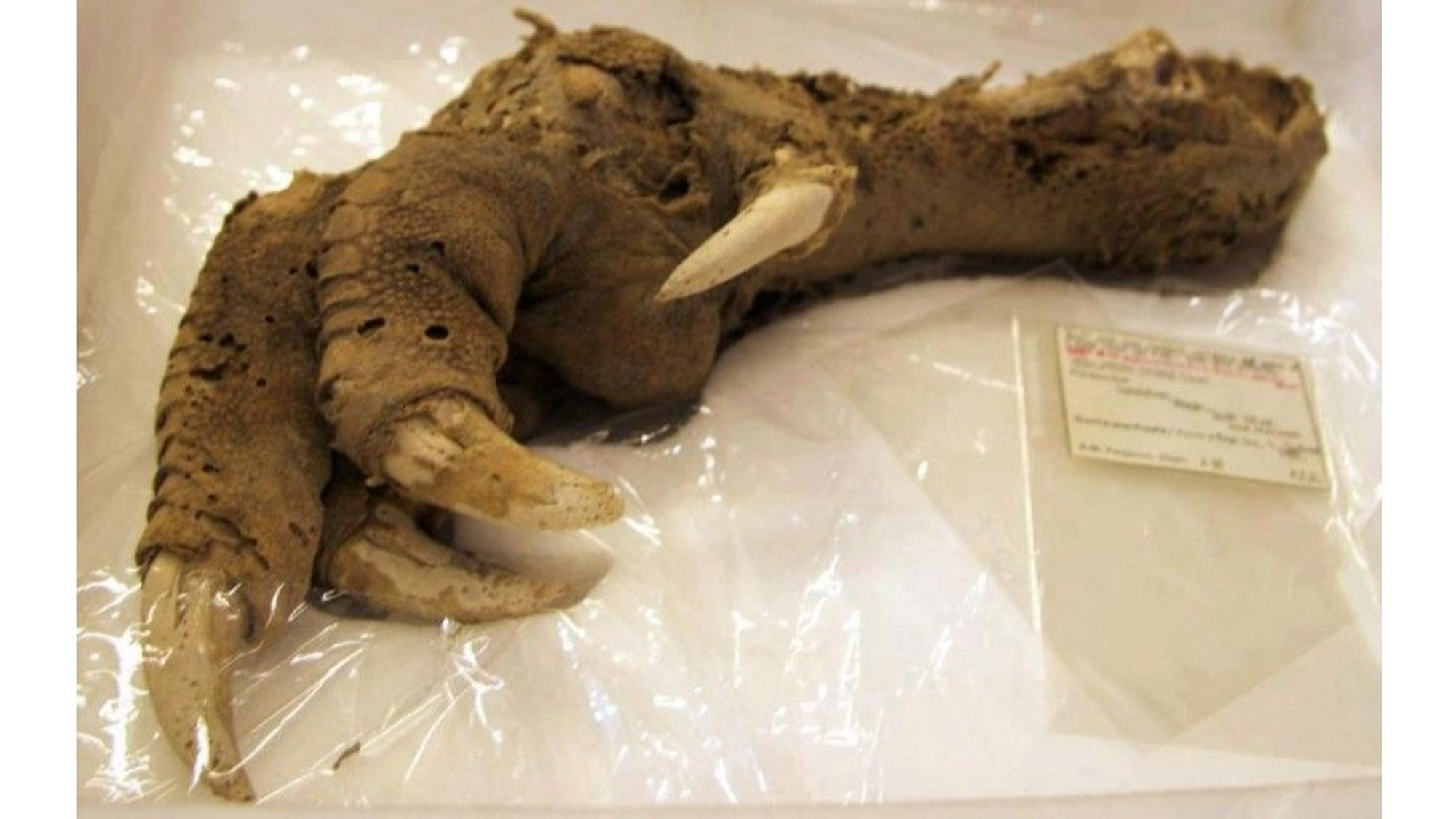 Bu bir moa ayağı. Daha bilimsel adıyla, Megalapteryx didinus türü, 18.5 milyon yıl kadar önce evrimleşip, soyu birkaç yüz yıl önce tükenmiş bir kuşa ait. Bu kuşlar, Yeni Zelanda'da yaşıyordu ve uçma yetisi evrimsel süreçte körelmiş olan gruba aitti.