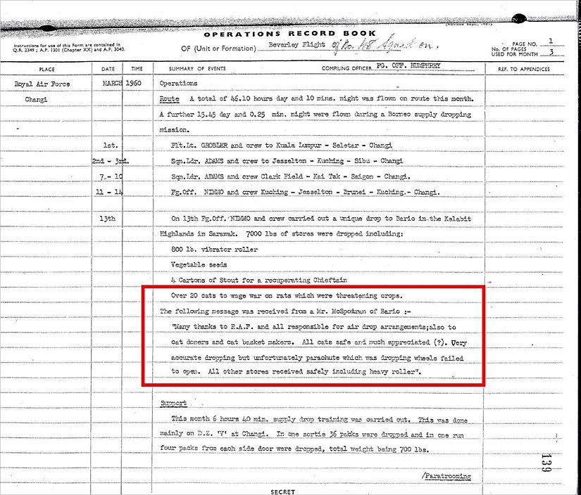 Kulağa gerçek dışı geliyor olsa da gazete haberlerine, çocuk kitaplarına, makalelere konu olan "Operation Cat Drop"un ("Kedi Bırakma Operasyonu") gerçek olabileceğine işaret eden en önemli delil olarak 13.03.1960 tarihli Kraliyet Hava Kuvvetlerine (RAF) ait uçuş kaydı gösteriliyor. Bu kayıt içerisinde 20’den fazla kedi içeren 3 tondan fazla bir yükün Saravak’ın dağlık arazilerine bırakıldığı belirtiliyor ve başarıyla sonuçlanan operasyon için kedileri bağışlayanlara, özel kutuları yapanlara ve RAF’a teşekkür ediliyor.