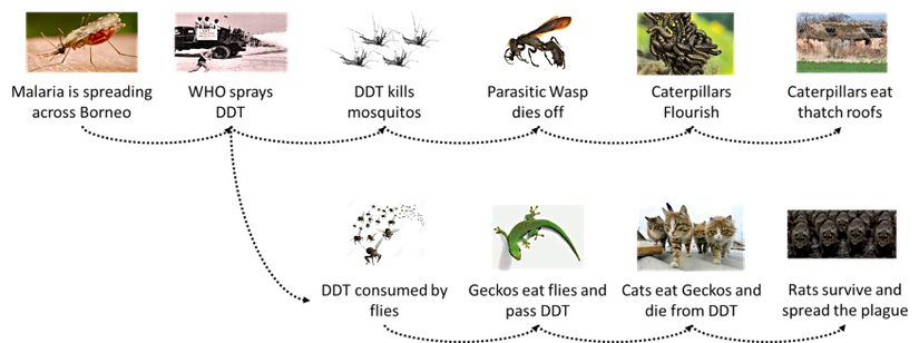 Bu ekolojik av-avcı ilişkisi, Saravak ve komşu eyaleti Sabah’ta çatıların çökmeye başlamasıyla insanların dikkatini çekebilmişti. Bölgedeki evlerin çatıları genellikle palmiye yapraklarından oluşuyordu. Çatılarda, yapraklarla beslenen tırtılların artması sonucu çökmeler meydana gelmişti. Tırtılların sayısını artıran sebep ise, onların ölümüne yol açan parazitik arıların ilaçlamalardan etkilenerek sayılarının azalmasıydı. Bu zincirin kedilere ulaşması ise, geko kertenkeleleriyle oldu. İlaçlardan etkilenmiş olan arı, sinek veya diğer böceklerle beslenen geko kertenkeleleri, DDT’den etkilenmiyordu; fakat bu kertenkelelerle beslenen kediler, o kadar şanslı değildi. Kedilerin ölmesiyle de fare sayısında artış başladı. Farelerin artması sonrası ekinler zarar görüyor ve sıtmadan yeni kurtulmaya başlayan halkı bu kez de veba ve tifo salgınları vuruyordu.