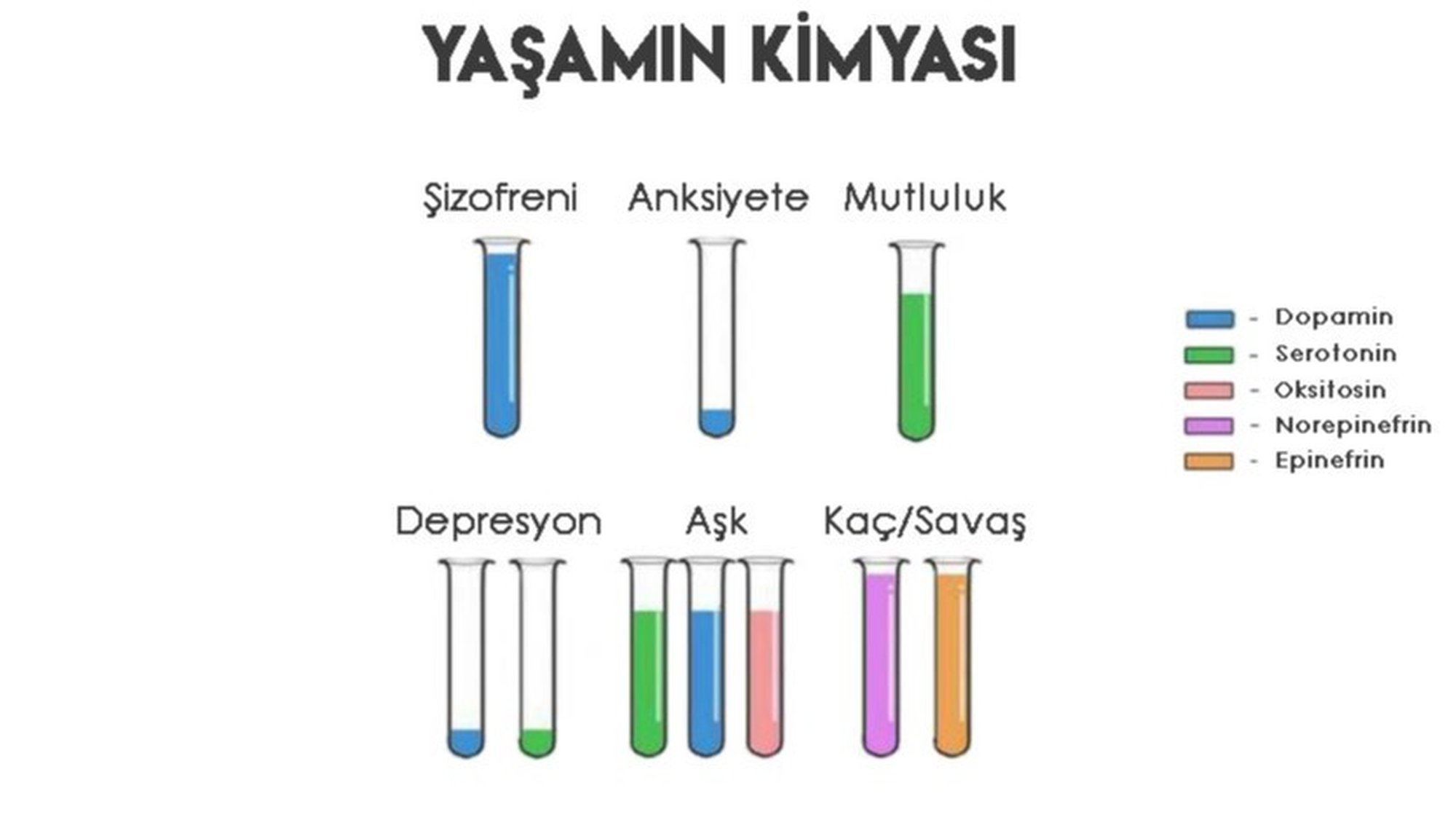 - Dopamin, serotonin, oksitosin, norepinefrin ve epinefrin gibi hormonların farklı oranlarda salgılanması, insanlarda şizofreni, anksiyete, mutluluk, depresyon, aşk ve kaç ya da savaş tepkileri gibi duygusal durumları belirler.