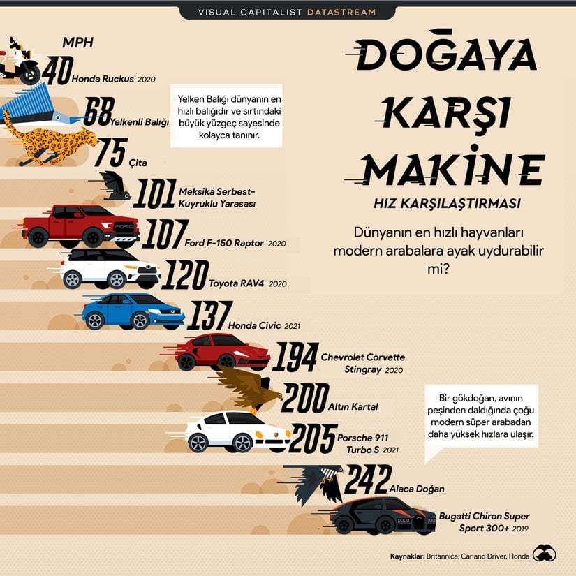 - Hayvanlar aleminin en hızlıları arasında gökdoğan saatte 389 km hıza ulaşırken, yelken balığı 110 km/sa ve çita 113 km/sa hız yapabilir.