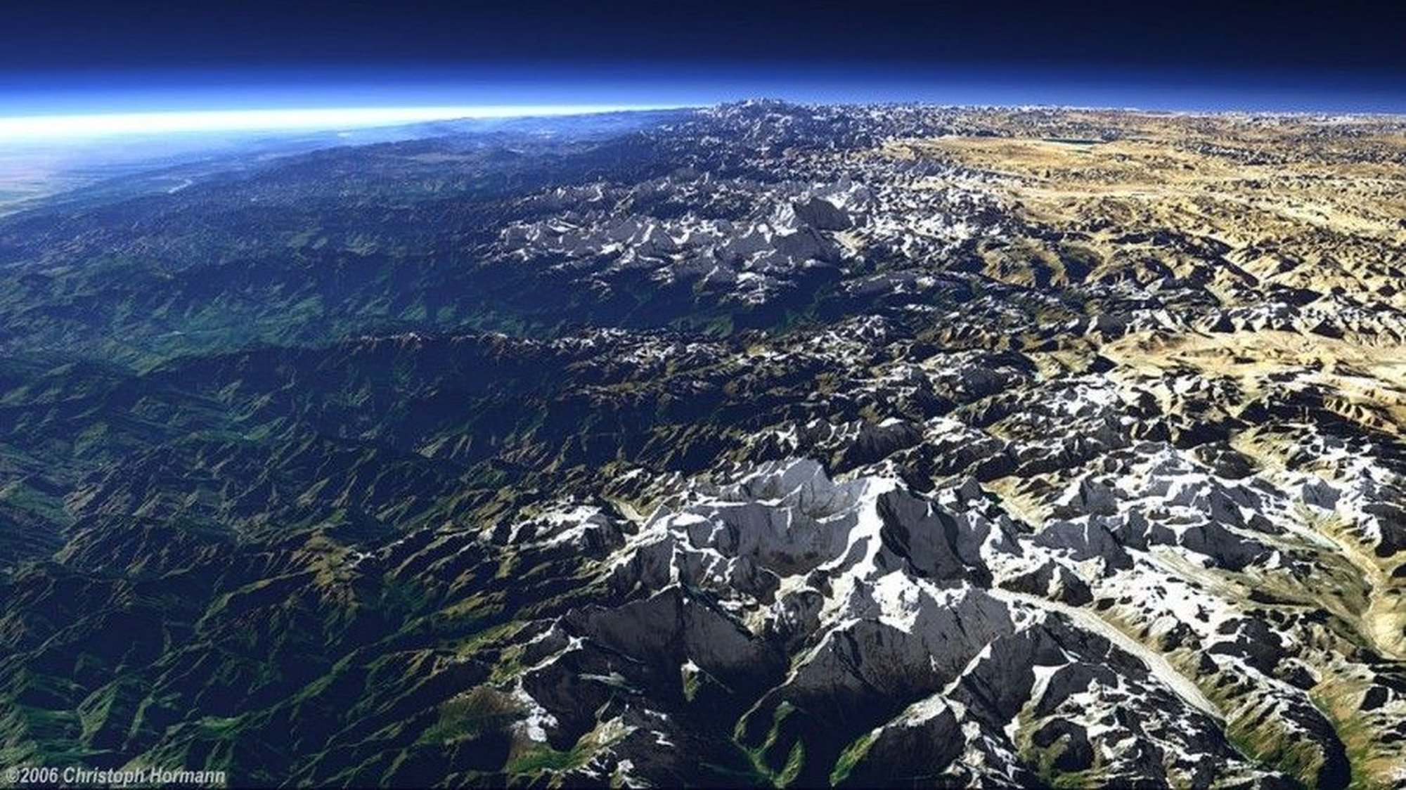 Himalayalar 2400 kilometre boyunca uzanır ve 150-400 kilometre genişliğe ulaşabilmektedirler. Fotoğrafta bu dağ sırasının bir kısmı uzaydan gözükmektedir.