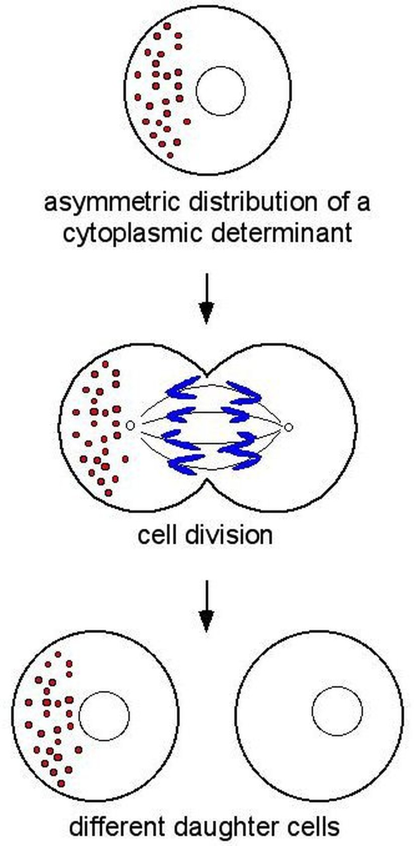 Sitoplazmik Ayrışma: Bazı kimyasallar, yerçekimi ve başka kimyasalların varlığı gibi etmenler sebebiyle, tamamen fizikokimyasal yollarla, eşit olmayan bir biçimde dağılırlar. Hücre bölünmesi sırasında meydana gelen sitoplazma bölünmesinde ise, bu kimyasallar bu sebeple eşit olarak dağılmazlar.