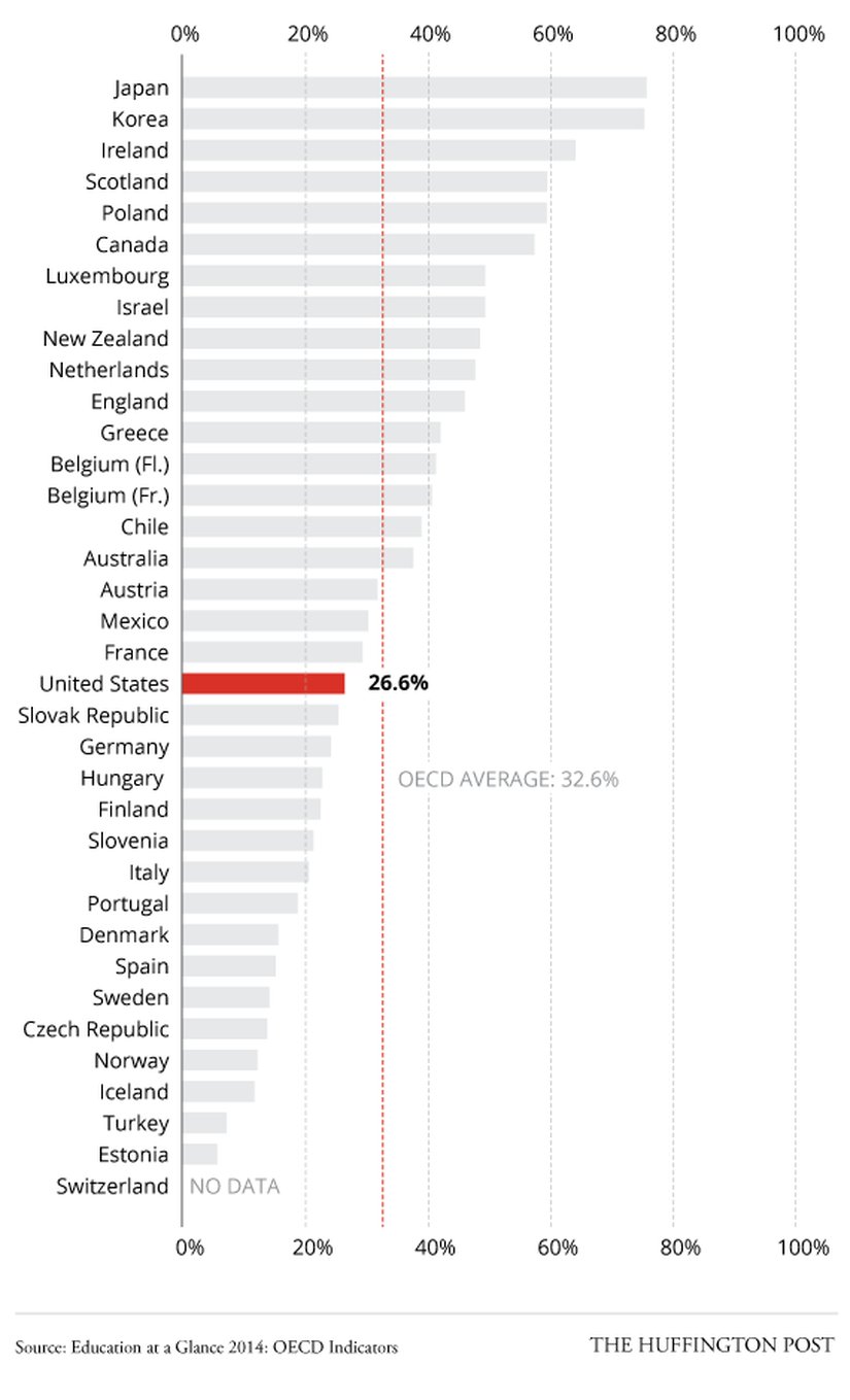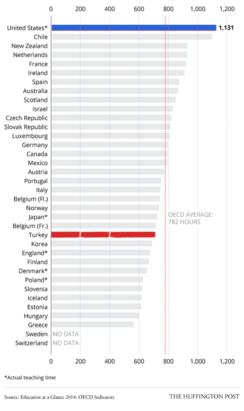 Ekonomik İşbirliği ve Gelişim Organizasyonu, 2014 yılının, Dünya'nın en gelişmiş ülkeleri için hazırladığı eğitim raporunu yayınladı. Rapora göre Amerikan ilkokul öğretmenleri ankette yer alan, Dünya'daki diğer tüm ülkelere kıyasla çok daha fazla çalışıyor. Görselde, ilkokul öğretmenlerinin sınıf içerisinde geçirdikleri süreler gösteriliyor.