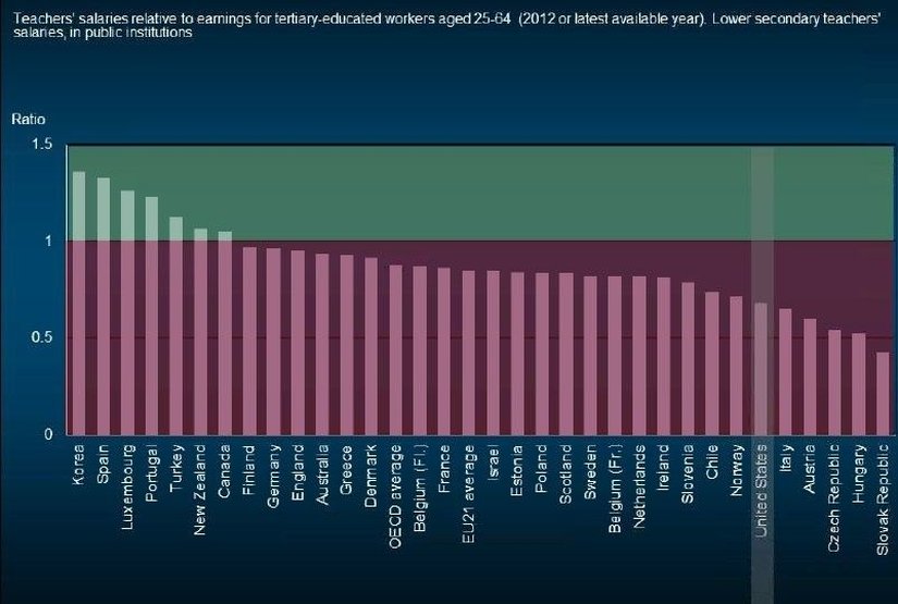 Buna karşın, ilginç bir şekilde alınan maaş, harcanan saatten fazla olarak karşımıza çıkıyor. Türkiye'de ilkokul öğretmenleri Dünya ortalamasının 1.1 katı maaş alırken; en yoğun çalışan ABD ilkokul öğretmenleri ortalamanın 0.6 katı kadar alıyor. Bu skala, öğretmenlerin aldığı maaşın yüksekokul bitirmiş işçilerin aldığı maaşa kıyasla belirleniyor. Aşağıda buna ait bir görsel görülüyor: