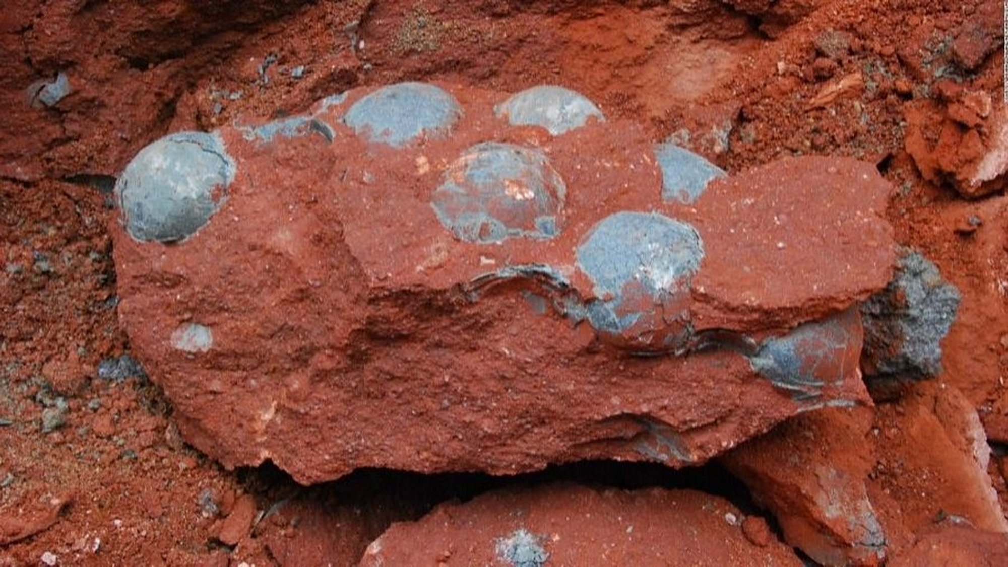 Burada gördüğünüz, Çin'in Guangdong bölgesindeki Heyuan şehrindeki bir inşaat çalışması sırasında kırılan kayaların içerisine gömülü halde bulunan dinozor yumurtası fosiller!